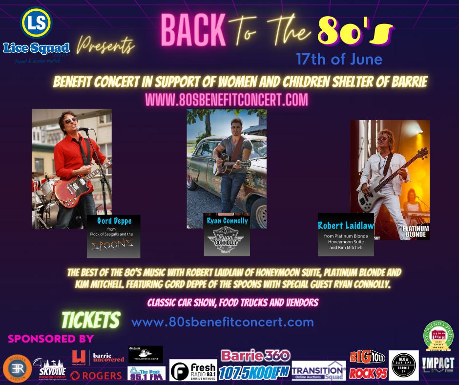 LICE SQUAD.com presents an 80’s SUMMER FESTIVAL in support of the Women and Children’s Shelter of Barrie. Join Lice Squad.com in celebrating their 20th anniversary June 17th at Wasaga Skydive Klondike Park featuring an 80sBenefit Concert, Superhero Skydive, Classic Car Show, Food Trucks, Vendor area, Beer Tent, Spirits, Live and silent auction, and entertainment featuring Robert Laidlaw performing the best of Honeymoon Suite, Platinum Blonde, plus Gordon Deppe of the Spoons & Flock of Seagulls with special guest Country music star Ryan Connolly!