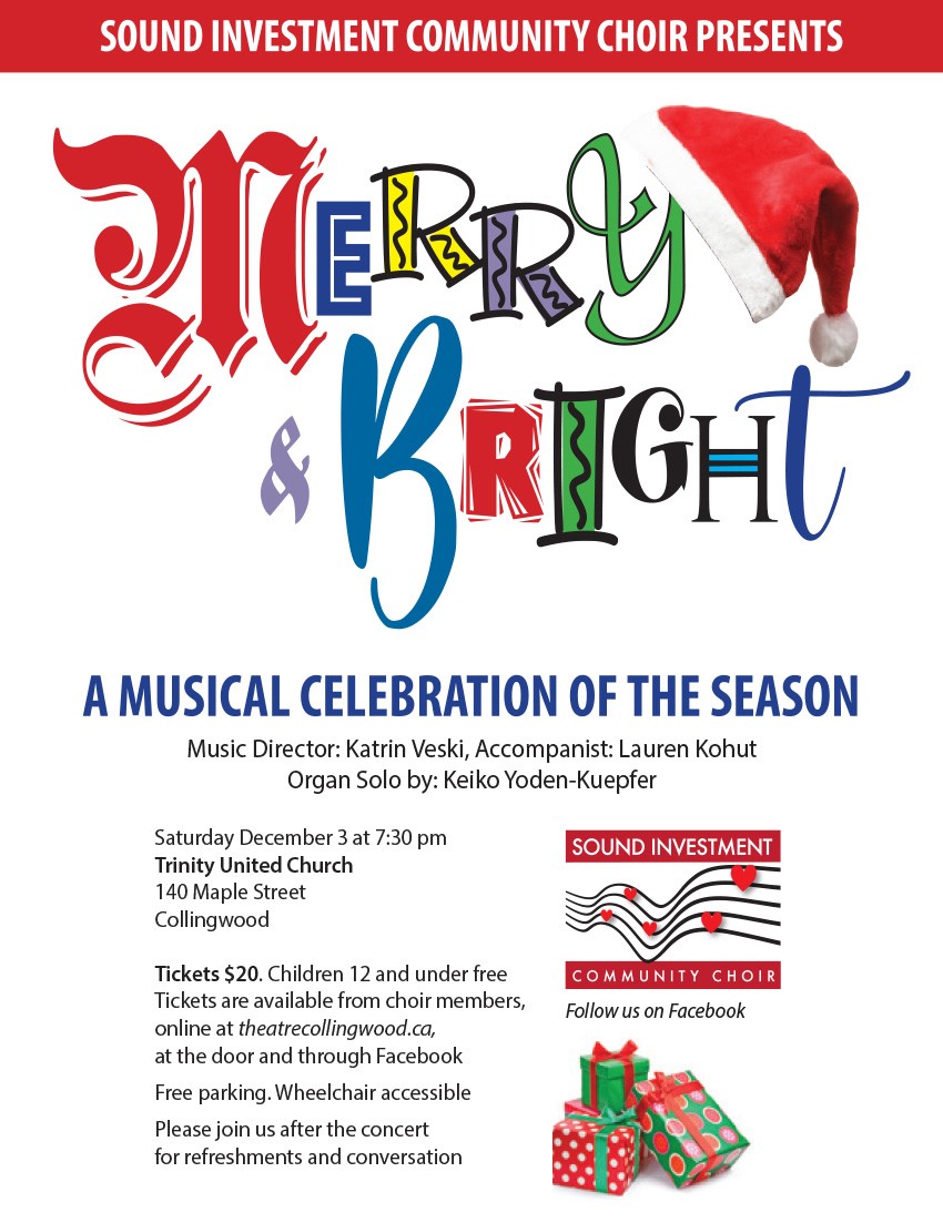Sound Investment Choir Presents Merry & Bright Where Trinity United Church, 140 Maple Street, Collingwood, ON Map When Dec 03/22 07:30 PM - Dec 03/22 09:30 PM Age All Website https://tickets.theatrecollingwood.ca/TheatreManager/1/online?performance=2131