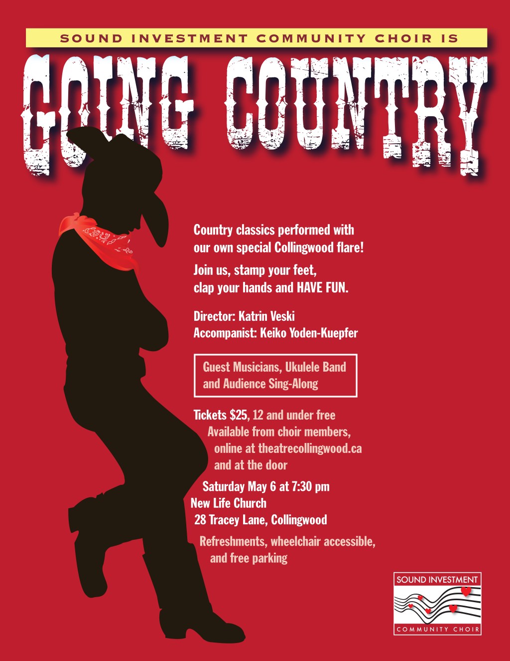Sound Investment Community Choir presents, Going Country, it’s first spring concert in three years! This will be a fun evening, featuring country classics, guest musicians, a ukulele band and an audience sing-along. Please join in, stamp your feet, clap your hands and have fun! refreshments will be served after the concert.