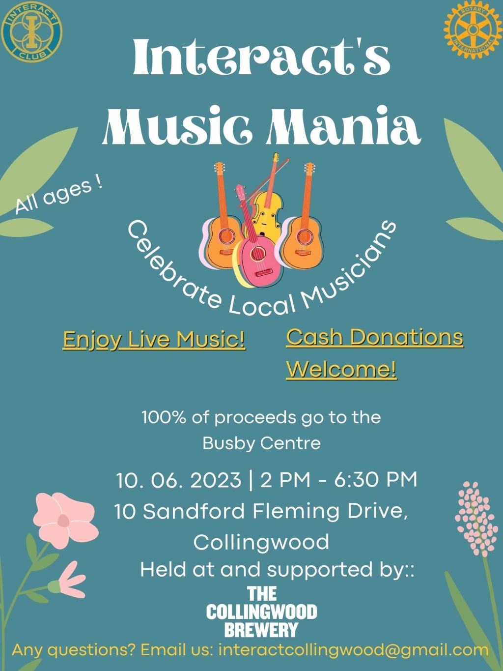 The Interact Club of Collingwood is hosting a music festival for all ages. Celebrating local youth and adult musicians, entrance is free, but donations will be collected to raise money for the Busby Centre. The outdoor event will be held at the Collingwood Brewery, which has graciously allowed us to use their space. To stay updated about the event, check us out on Instagram and Facebook @interactclubofcollingwood. Check out the Collingwood Brewery @collingwoodbrewery