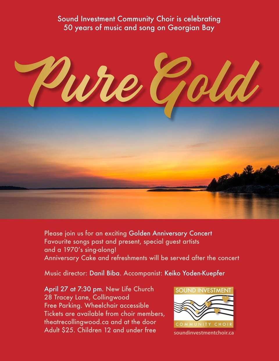 Sound Investment Community Choir presents an exciting Golden Anniversary Concert, celebrating 50 years of music and song on Georgian Bay. Guest artists, 1970’s sing-along. Anniversary cake and Refreshments. Join us as we celebrate this milestone event.