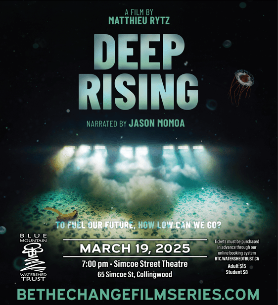 Be The Change Film Series continues Season 17 with a 7 pm screening of DEEP RISING on Wednesday March 19, 2025 at the Simcoe Street Theatre. Narrated by Jason Momoa, the film investigates how a demand for finite metals is driving the potential destruction of the world’s last pristine wilderness – the deep ocean. DEEP RISING explores the complex energy issues facing our world and how we can move to a true green energy future using solutions that don’t destroy pristine environments.