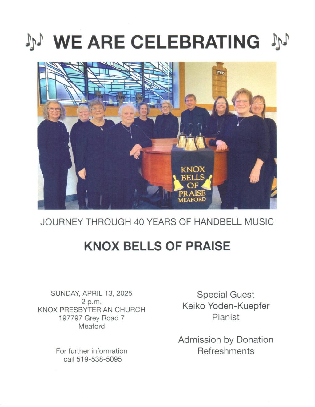 The Knox Bells of Praise are celebrating 40years of handbell music. If you’ve never heard handbells, this is a real treat. With Special Guest Keiko Yoden-Kuepfer on the piano. Admission by donation. Intermission with refreshments.