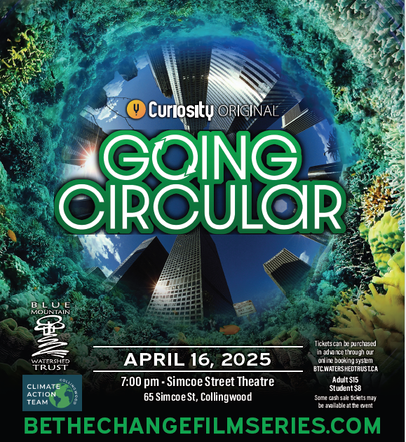 Be The Change Film Series (BTC) is pleased to present GOING CIRCULAR on Wednesday April 16, 2025; 7pm at the Simcoe Street Theatre. The Collingwood Climate Action Team worked with BTC to bring this solution focused film in time for Earth Day 2025. GOING CIRCULAR imagines a future where we mimic the genius of nature – to re-calibrate the way humankind lives, breathes, and builds – respecting the limits of our resources and transforming the modern world. GOING CIRCULAR unlocks the secrets to circularity, an innovative concept that could save our collective future on Earth. Sometimes the best solutions come from surprising places.