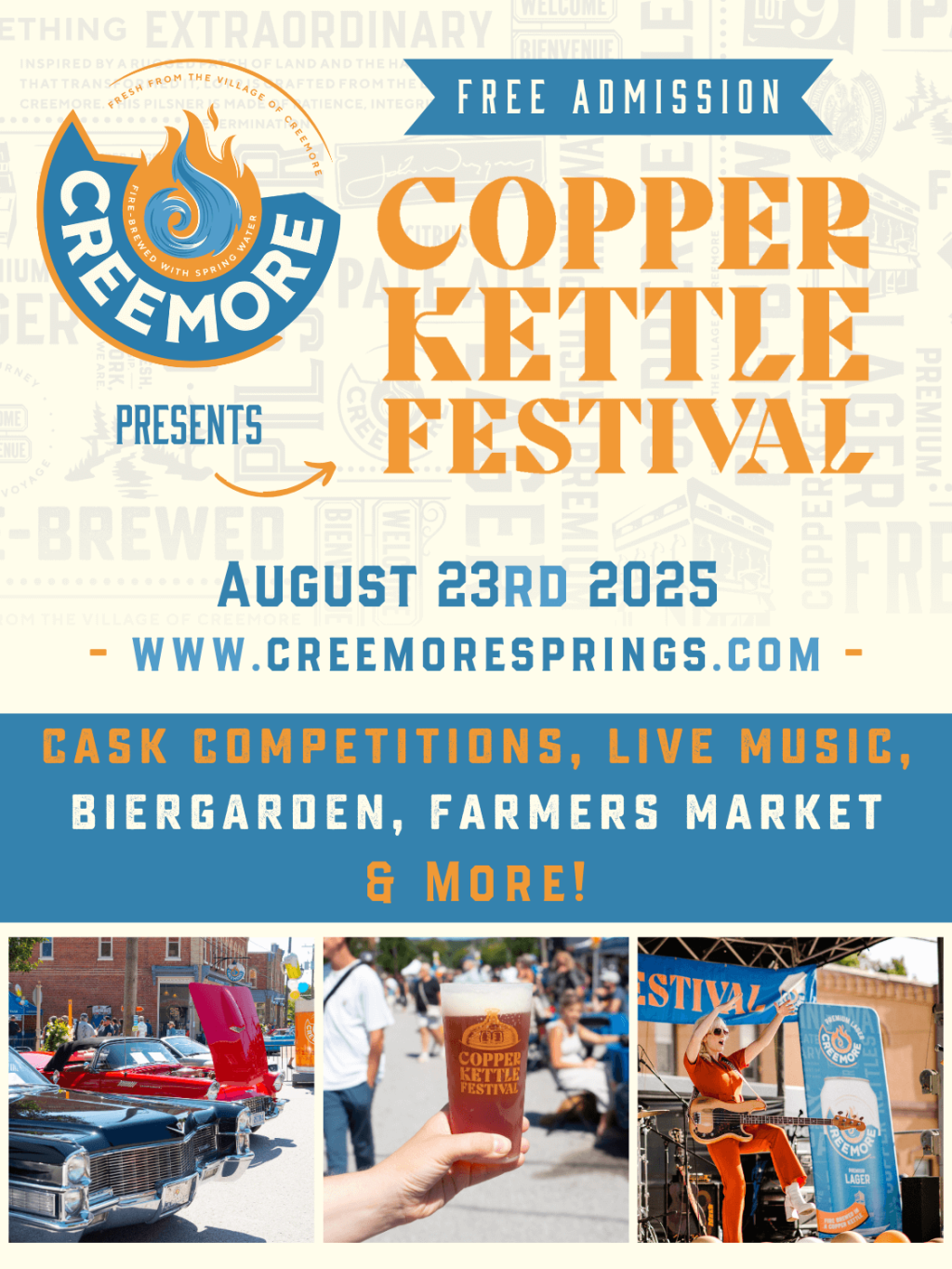 Don’t miss the local artisans market, classic car show from 10AM-4PM, brewery tours from 11AM-6PM and kids’ activities all day! The Beinn Gorm Highlanders Pipe Band march down Mill Street at 11AM to officially kick off the Creemore Springs Copper Kettle Festival. Free entertainment on the main stage until 6PM.