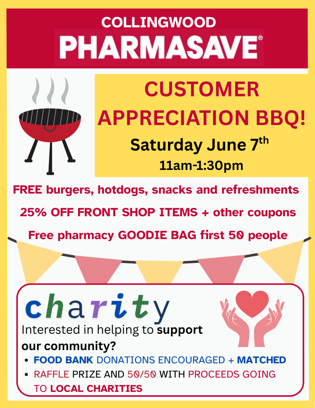 Collingwood Pharmasave invites you to come out and celebrate their customer appreciation BBQ. On Saturday June 7th come and enjoy a free hamburger or hotdog, refreshments and snacks. The first 50 BBQ attendees will also leave with free goodie bags! Great savings on front shop items all day long. Plus, bring a food bank donation and the pharmacy will match it! Get in on the raffle and 50/50 draw whereby all proceeds will go to supporting charities in our community. It’s Collingwood Pharmasave’s way of saying thank you. Collingwood Pharmasave Customer Appreciation Lunch BBQ