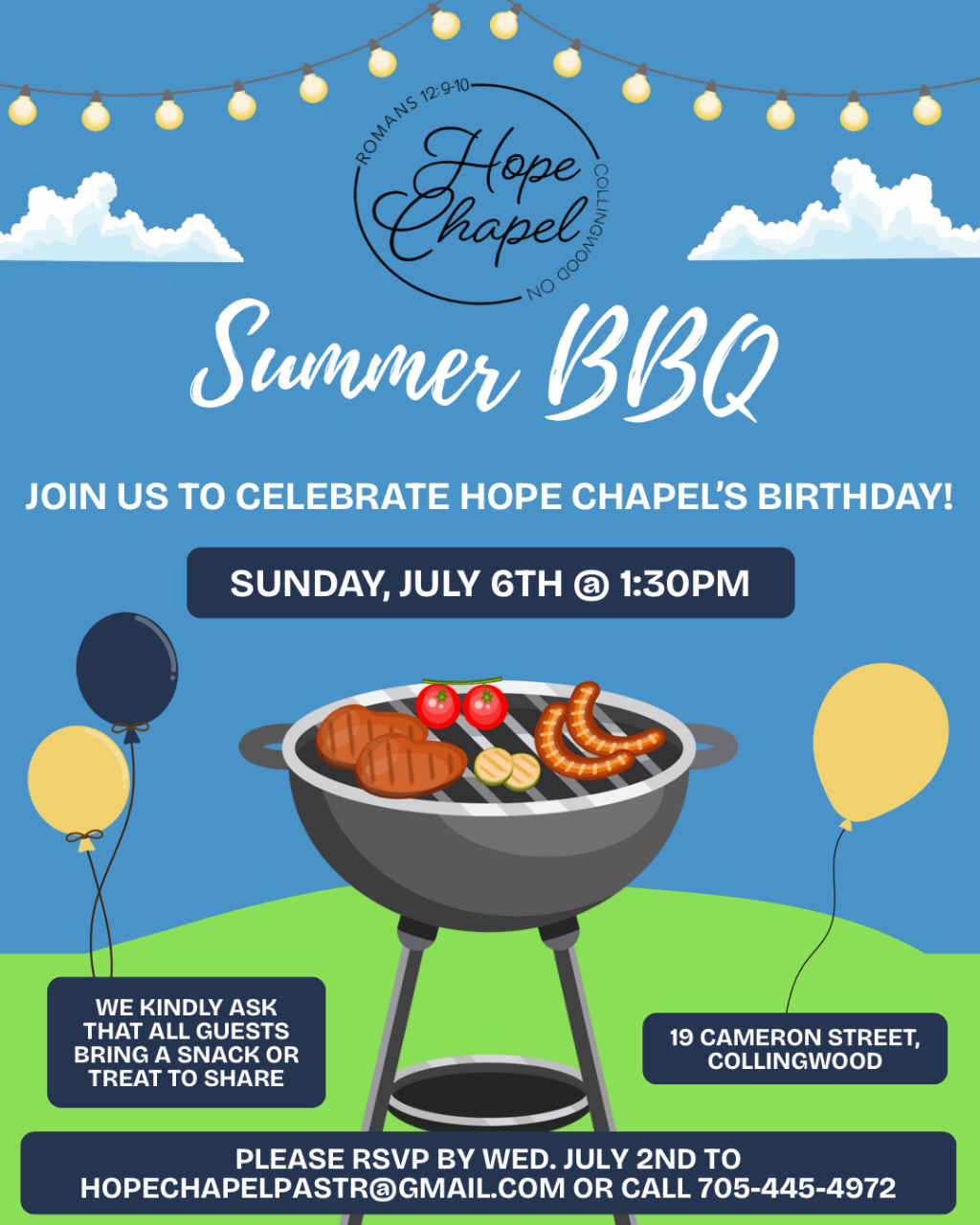 | Join us for a summer BBQ to celebrate Hope Chapel’s birthday! BBQ meal will be provided, but we kindly ask that all guests bring a snack or treat to share. Please RSVP to Pastor Jane by Wednesday, July 2nd by email hopechapelpastr@gmail.com or by phone 705-445-4972 |