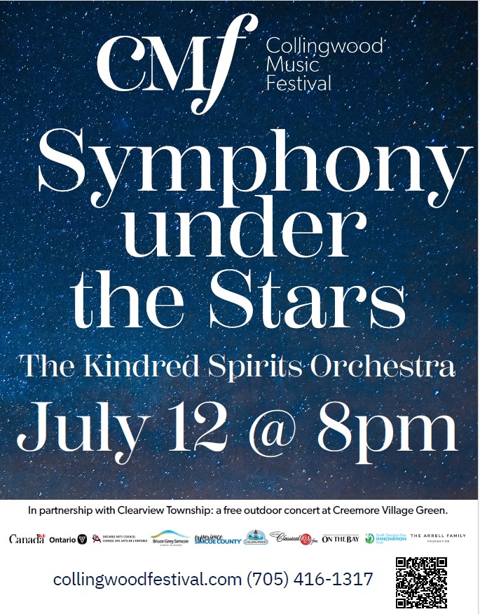 In Collaboration with Clearview Township, the Collingwood Music Festival is delighted to present “Symphony Under the Stars”, a complimentary outdoor concert featuring the acclaimed Kindred Spirits Orchestra. Set in the scenic “Creemore Village Green”, this family-friendly event invites you to bring your children, pack a picnic basket, and enjoy an evening of familiar tunes with film music and pop songs. Experience a vibrant, cinematic musical journey in the heart of Creemore, as we come together to celebrate community and culture under the stars.
