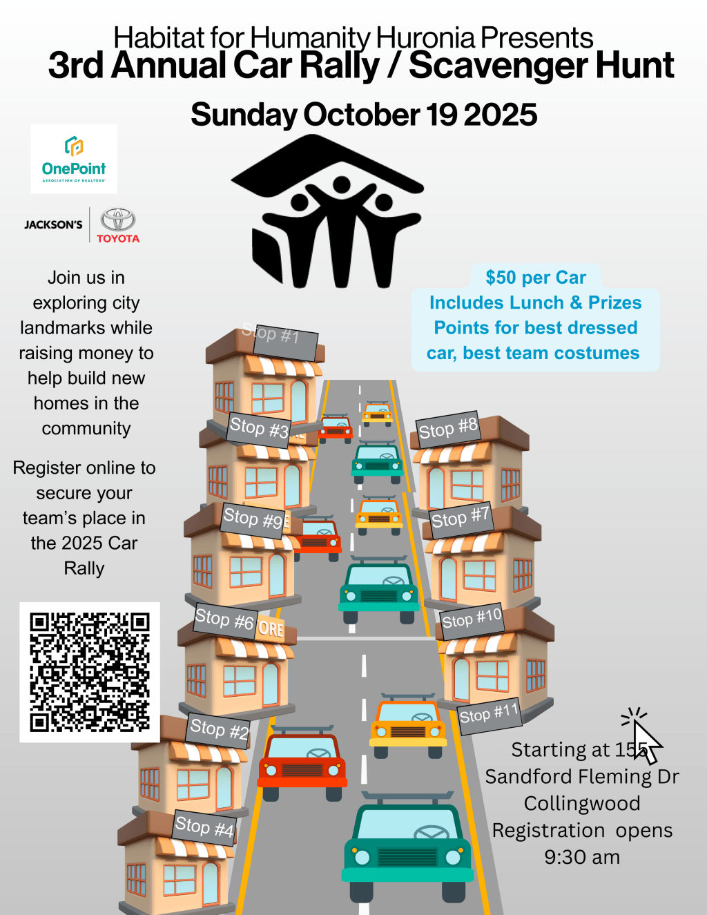 Don’t’ know what a car rally is? Well, let me tell you …… it’s a scavenger-hunt type of event in which you get together with friends and family in a vehicle (not necessarily a car) and begin a hunt for specific locations listed that range from signage to leap frogging over one another down the main street of Collingwood. There is a registration fee for a carload and pledges are accepted, photos & video taken with your phone will be proof of location. There will be mandatory stops, extra points, and absolute fun at all times, most points wins…….. Rain or Shine we want you there!