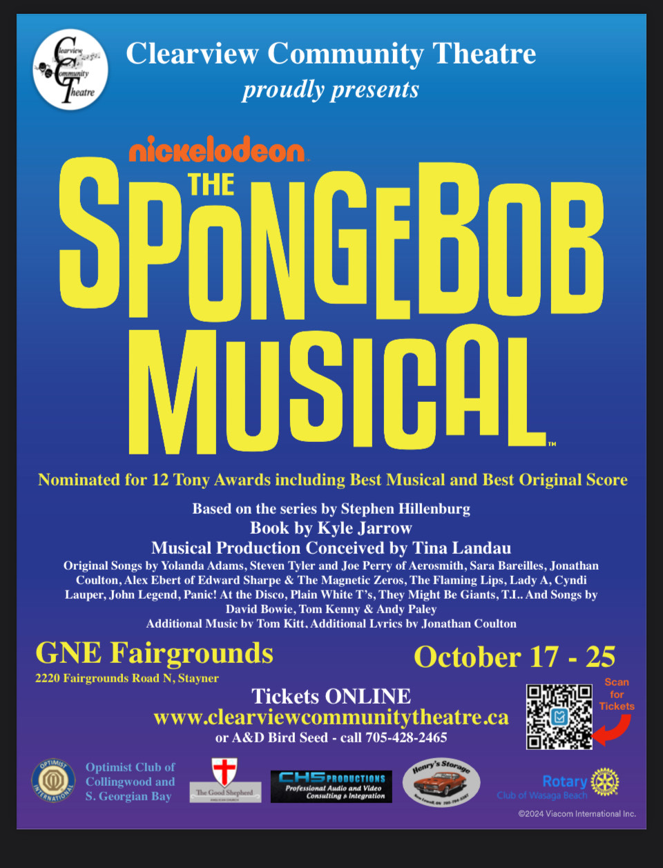 The SpongeBob Musical Where GNE Fairgrounds , 2220 Fairgrounds Rd N, Stayner Map When Oct 17/25 12:00 AM - Oct 02/25 11:00 PM Age All Website clearviewcommunitytheatre.ca