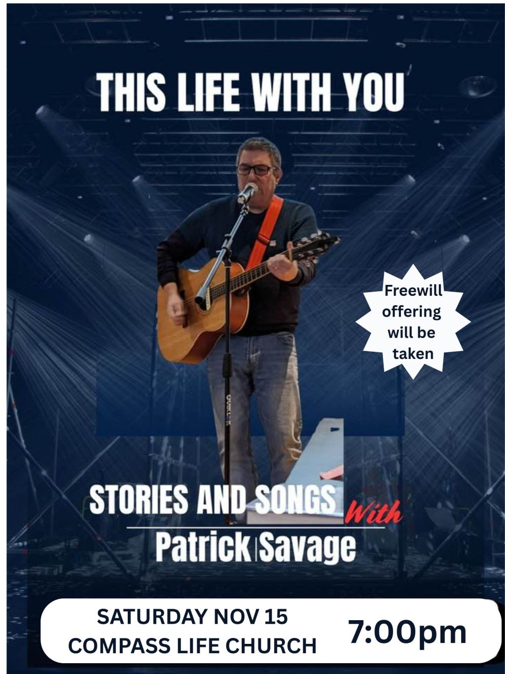 This Life With You Where Compass Life Church, 202 Ontario St., Stayner Map When Nov 15/25 07:00 PM - Nov 15/25 09:00 PM Age All Website http://www.compasslifechurch.ca/ Join us for stories and songs with Pat Savage as he leads us in worship and entertainment.
