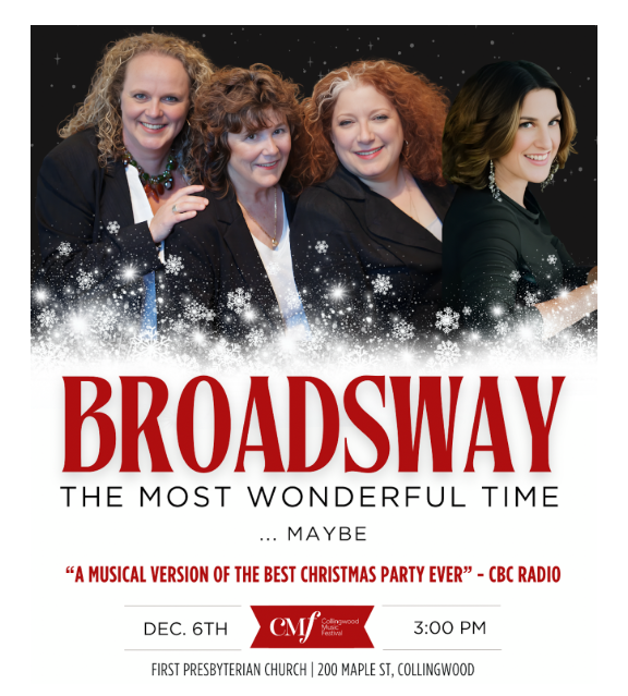 COLLINGWOOD MUSIC FESTIVAL presents BROADSWAY in “!” The Collingwood Music Festival proudly presents BROADSWAY, four of Canada’s finest musical theatre, jazz and cabaret artists singing their unique arrangements of Broadway yuletide classics and lesser-known seasonal gems in “The Most Wonderful Time … Maybe!”. Featuring Diane Leah, Heather Bambrick, Julie Michels and Kylie Martin. At First Presbyterian Church, 200 Maple Street, Collingwood L9Y 2R2 . Tickets are $46.50 ea from