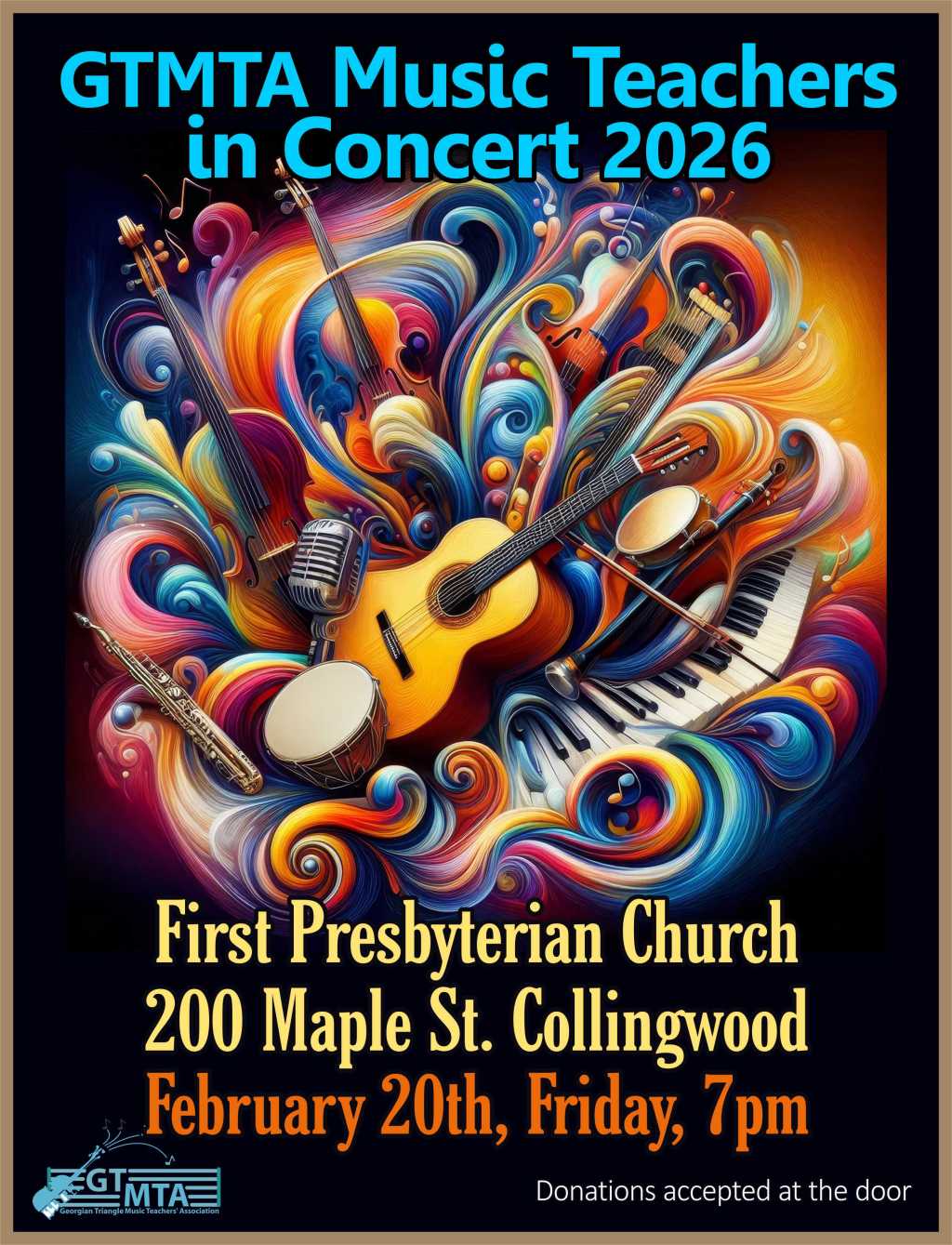 The Georgian Triangle Music Teachers’ Association presents: GTMTA Music Teachers in Concert. This concert features music teachers from a variety of disciplines, including piano, voice, percussion, woodwinds, and strings. Normally we hear the students perform–this time, you get to hear the teachers! No tickets necessary; a freewill offering will be collected to help offset the costs of this event