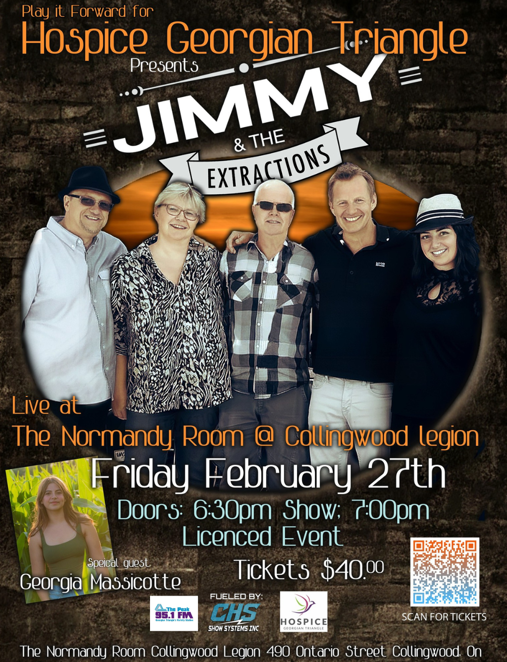 Come join us at Royal Canadian Legion Branch 63 for a fun-filled event in support of Hospice Georgian Triangle! We’re thrilled to invite you to the 2nd Annual Play It Forward featuring Jimmy and the Extractions, an event you won’t want to miss! Friday, Feb 27th. Doors open at 7:00 PM. Come enjoy a lively night of great music and dancing while supporting a meaningful cause. All proceeds will benefit Hospice Georgian Triangle, helping provide compassionate care for those who need it most. Bring your friends, spread the word, and let’s make a difference together. Don’t miss out on this opportunity to have a blast while giving back!