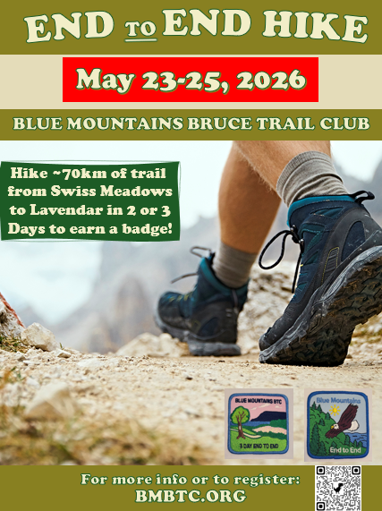 Join us May 23-25, 2026, for the Blue Mountains Bruce Trail Club End-to-End hike event, winding through the beautiful and varied terrain of the Blue Mountains Club trails. Enjoy the early signs of nature awakening, the beautiful vistas and the rugged escarpment.
