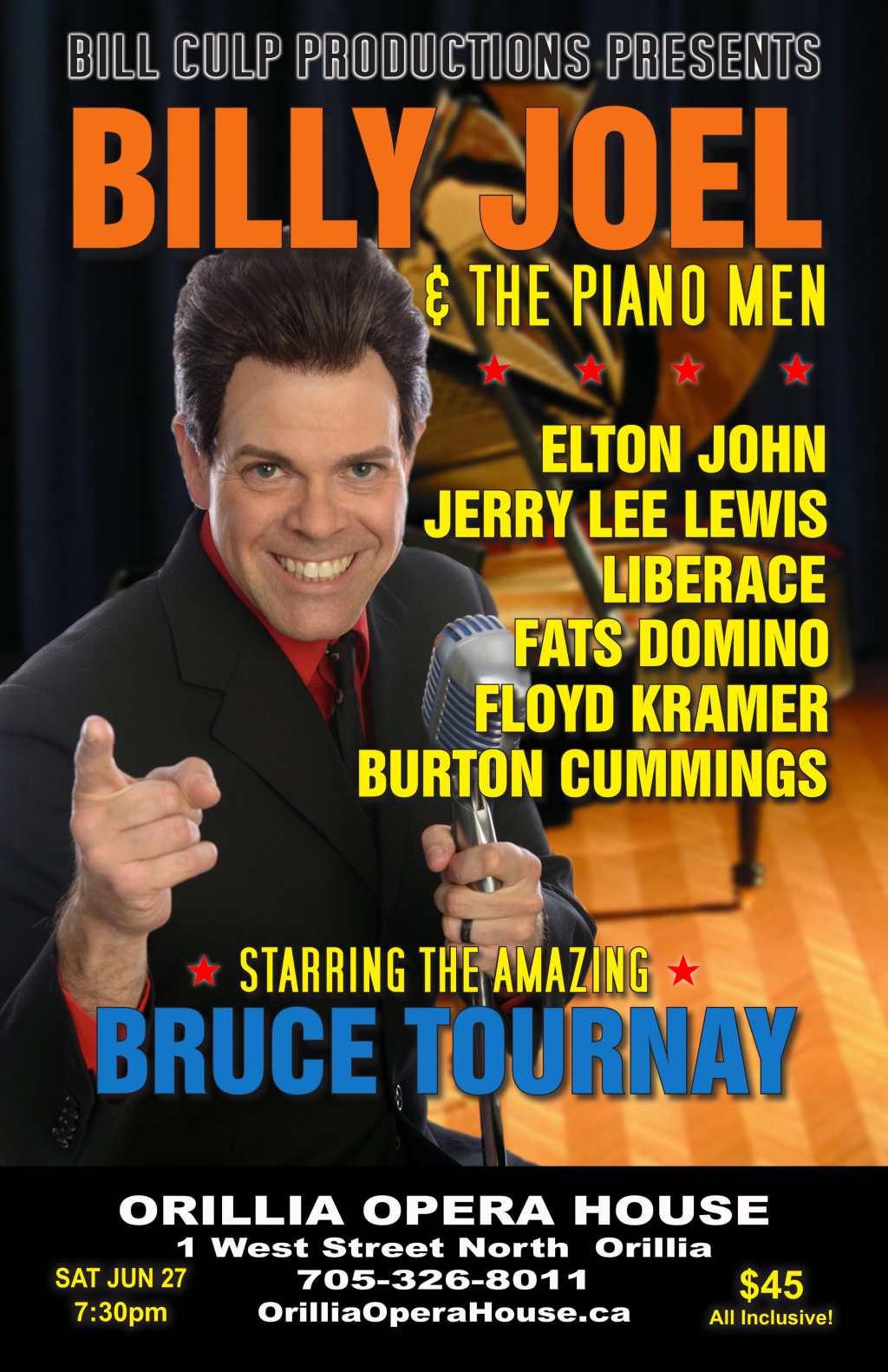 “Billy Joel and The Piano Men” celebrates the greatest piano artists of all time including Billy Joel, Elton John, Burton Cummings, Ray Charles, Jerry Lee Lewis, Nat King Cole, Liberace, Fats Domino, Floyd Cramer and more. Starring the amazing Bruce Tournay from the Memphis Cats on piano and vocals, this unique show combines fantastic live performances with costumes, humour and interesting stories relating to the music and artists being performed. You’ll hear Bruce sing many of your favourite classics including “Piano Man,” “Crocodile Rock,” “Great Balls of Fire,” “My Own Way To Rock” and “Blueberry Hill” amongst many other timeless piano classics!