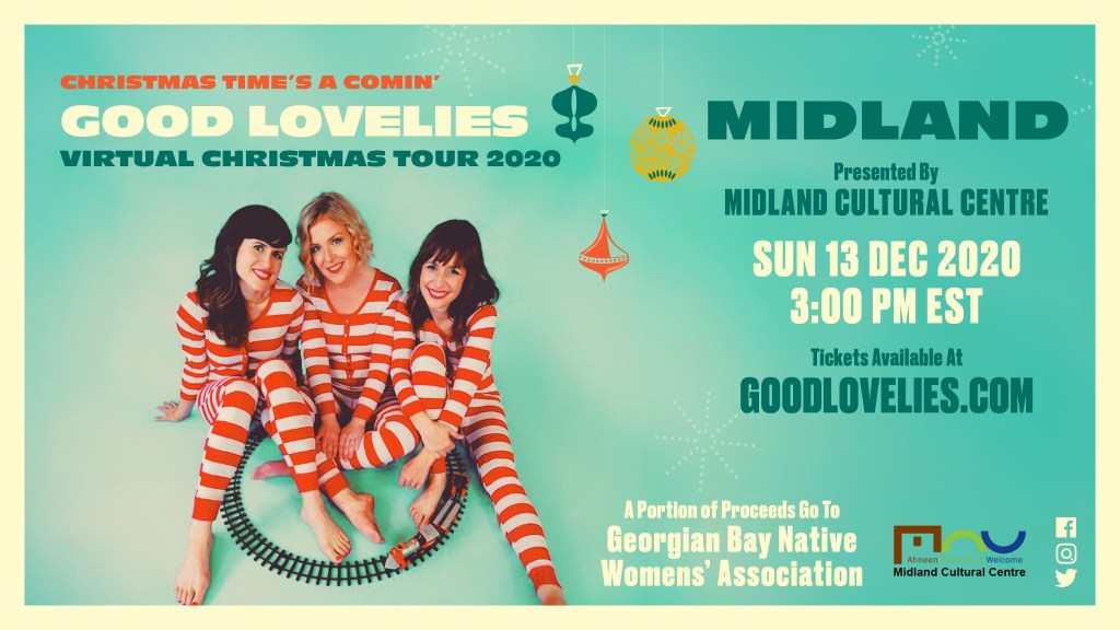 Good Lovelies are coming to Midland….virtually. Join us on December 13th at 3:00pm for Midlands own concert. A portion of ticket sales from this show will be donated to the Georgian Bay Native Womens’ Association